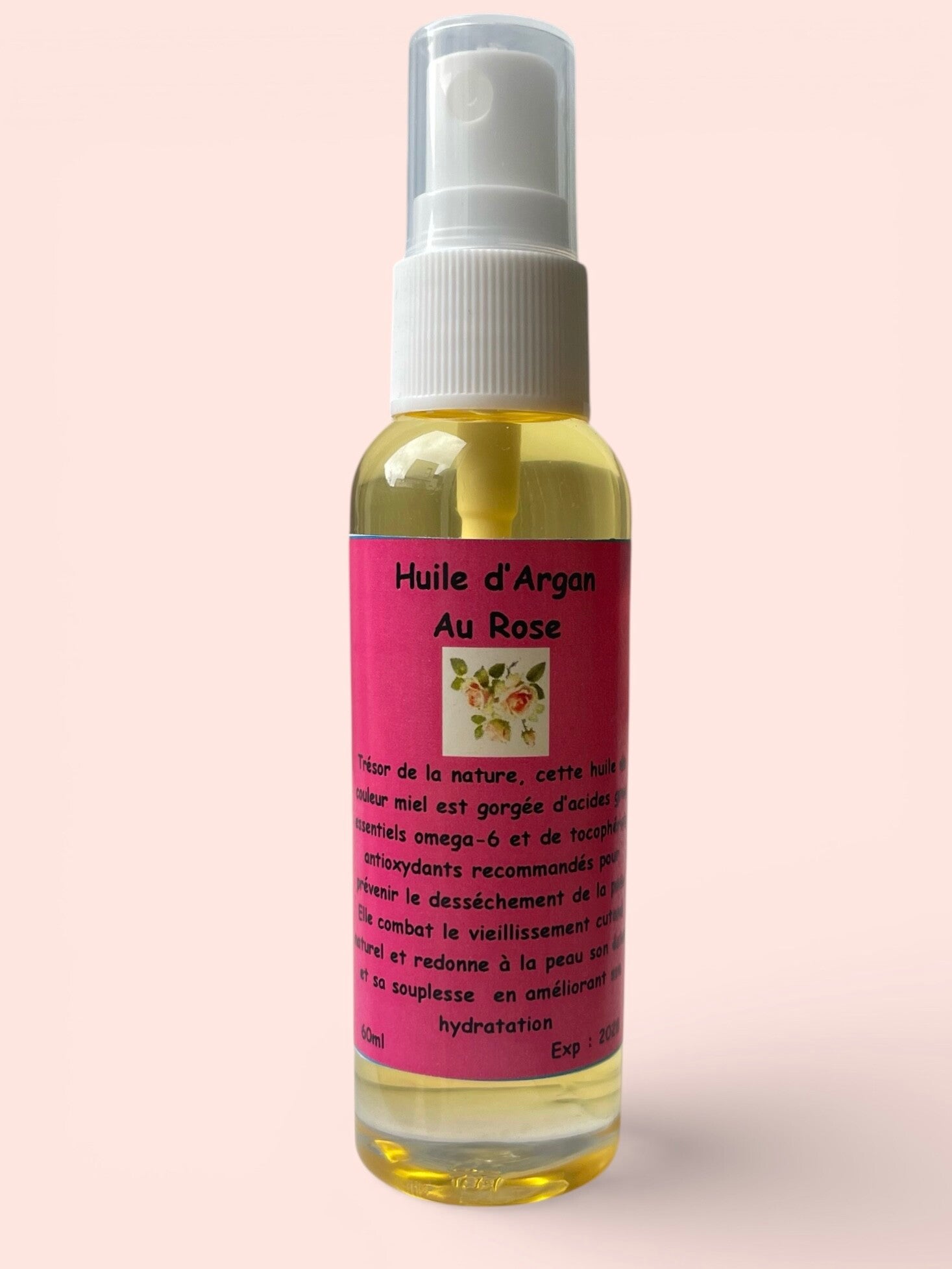 Huile d’argan marocaine parfumée à la rose. Soin cosmétique artisanal hydratant et raffermissant pour le visage, le corps et les cheveux.