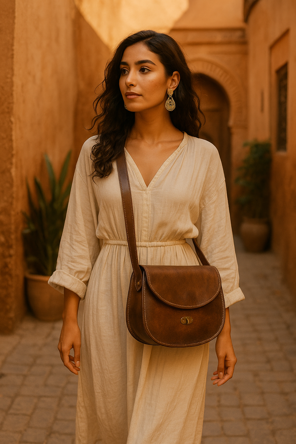 Sac Postier en Cuir Artisanal du Maroc – Cuir de Vachette Marron Vintage “Taznakht” Fait Main