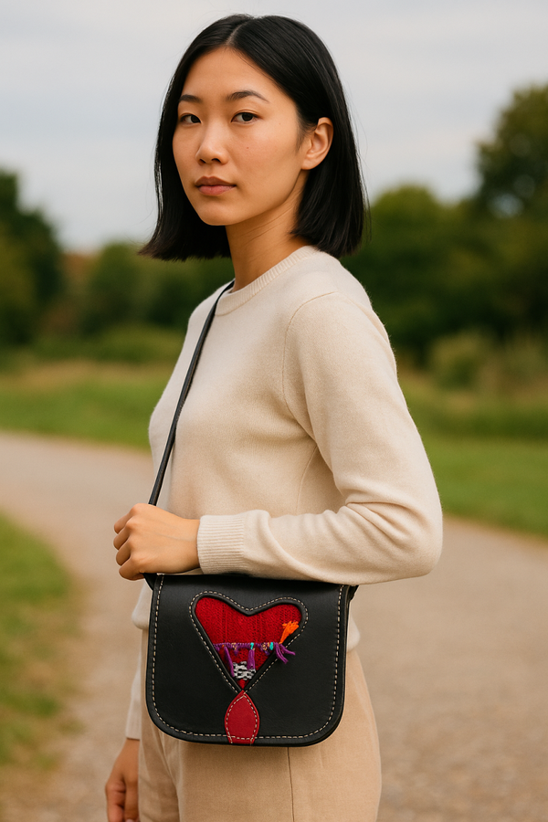 Sacoche berbère artisanale en cuir noir et tissu berbère vintage – Motif cœur rouge du Maroc