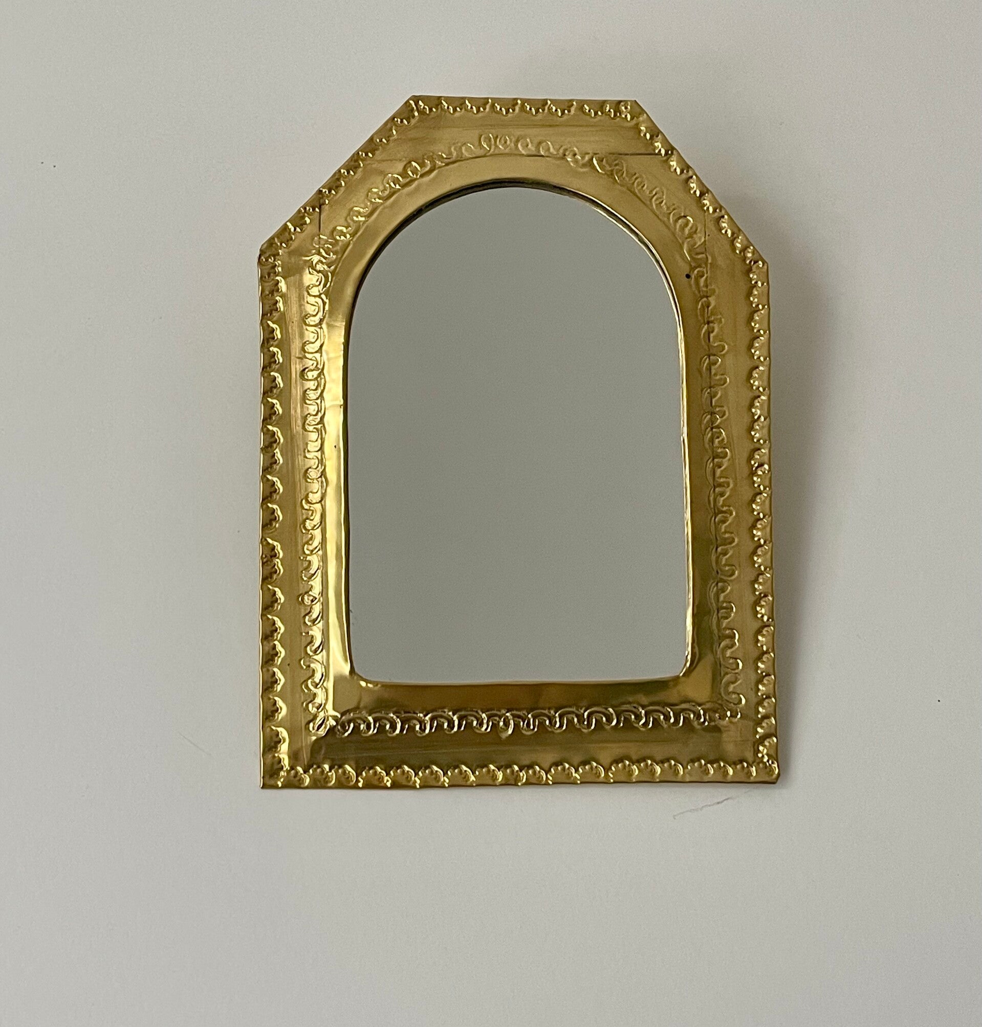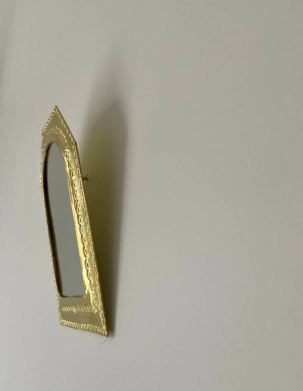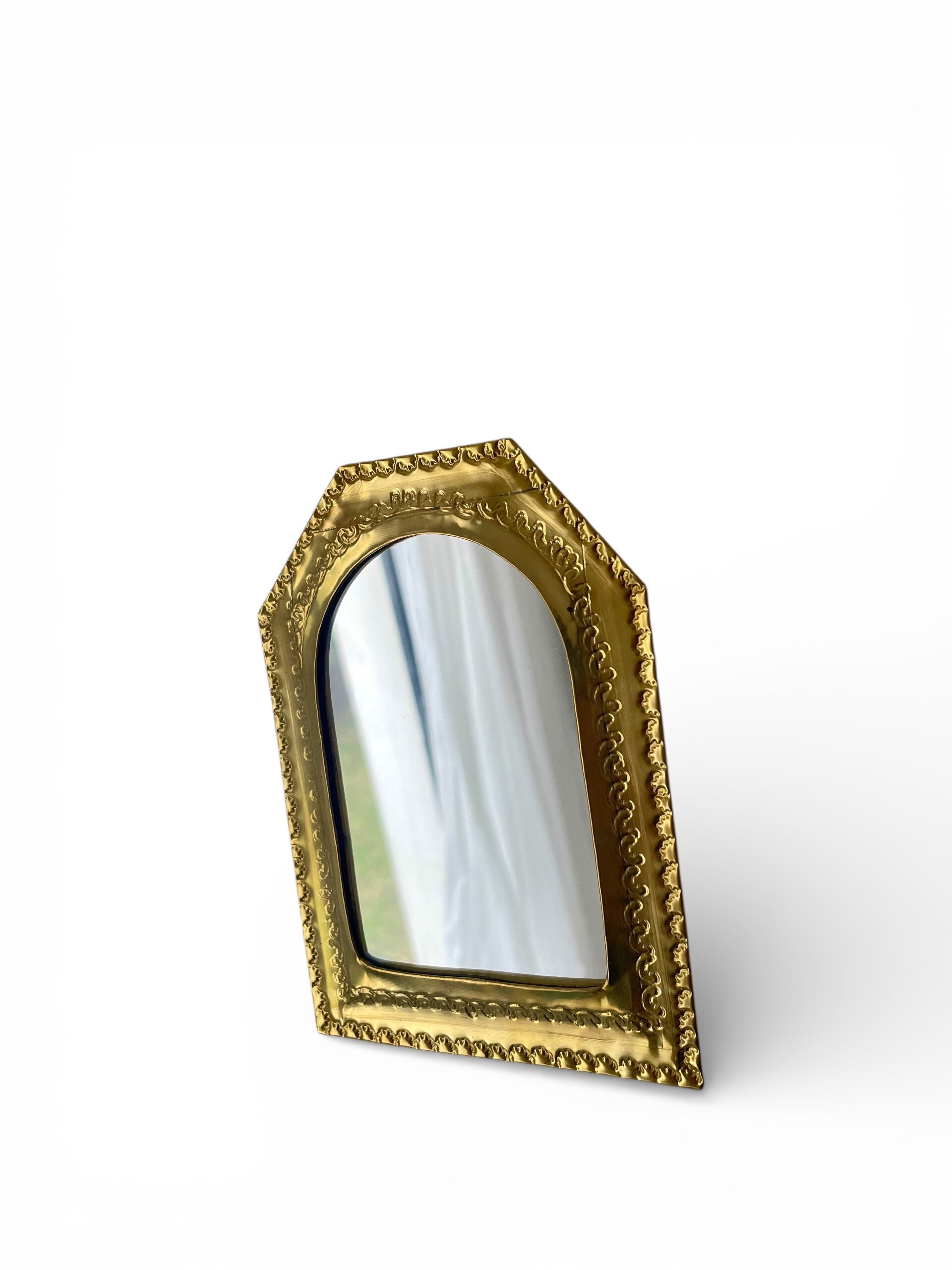 Compact et pratique, ce miroir peut être posé sur une coiffeuse, une table de maquillage ou une étagère. Sa finition dorée lui donne un charme intemporel, à mi-chemin entre tradition artisanale et modernité.