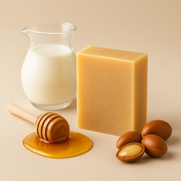 Le savon naturel au miel, au lait et à l’huile d’argan est un soin artisanal marocain unique. Le lait hydrate et adoucit, le miel régénère et illumine, tandis que l’huile d’argan du Maroc nourrit en profondeur et protège la peau du dessèchement. Ensemble, ces trésors naturels offrent un rituel de beauté inspiré du hammam traditionnel, pour une peau douce, éclatante et veloutée.